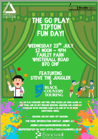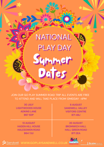 Please see attached the flyer for the summer holidays, the Tipton Fun Day and National Play Day Summer Dates or visit the website for a full calendar of events – www.goplaysandwell.co.uk